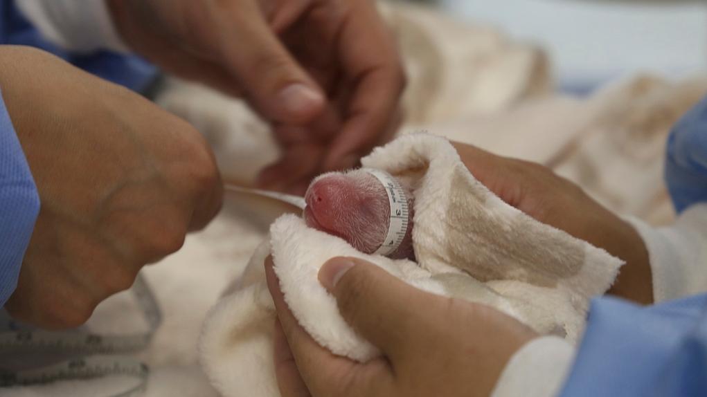 八月二十二日,在德国首都柏林,工作人员对旅德熊猫“梦想”生下的幼仔进行了测量。 新华社 图