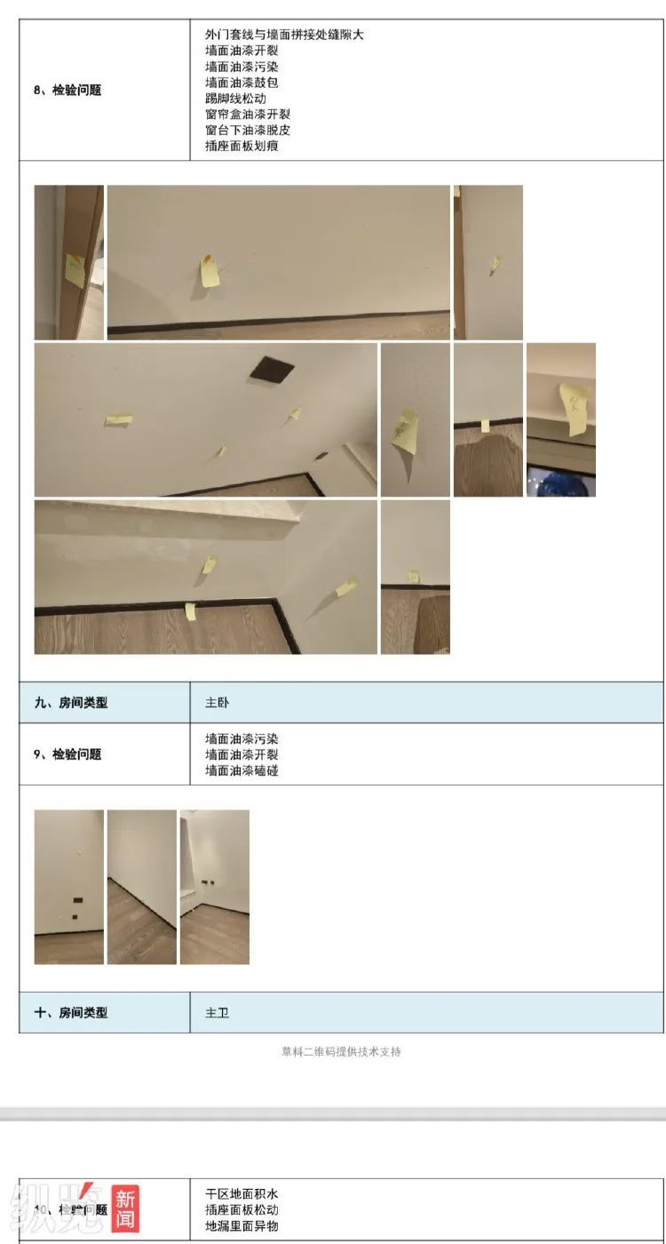 根据陈女士之前的介绍,退房时,房东找了一个专业的验房师,喊着手电筒一点一点检查,标注了70-80个问题,包括墙面油漆污染、插座面板划痕、干燥区域的积水等。也给了她一份房屋检查报告。