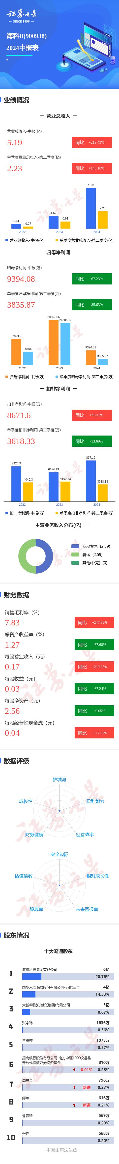 海科,证券之星消息 B2024 年中报告显示,公司主要收入 5.19 亿元,同比增长 219.43%;归母净利 9394.09 一万元,同比下降 67.23%;扣非净利润 8671.61 一万元,同比增长 40.45%;其中 2024 2008年第二季度,公司单季度主营收入 2.24 亿元,同比增长 145.18%;单季度归母净利润 3835.87 一万元,同比下降 85.63%;单季度扣除非净利润 3618.34 一万元,同比下降 13.69%;负债率 投资收益20.51% 5201.57 一万元,财务费用 -3639.15 万元,毛利率 7.83%。