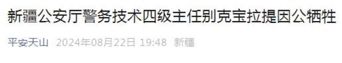 据“平安天山”微信微信官方账号消息,8月21日,新疆维吾尔自治区公安厅警务技术四级主任别克宝拉提因抢救无效,因公牺牲,工作期间突发疾病,年仅43岁。
