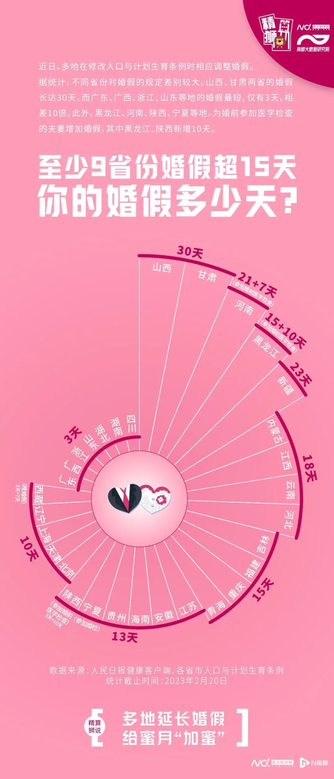 当前,全国各省最长婚假和最短婚假之间的差距是10倍。