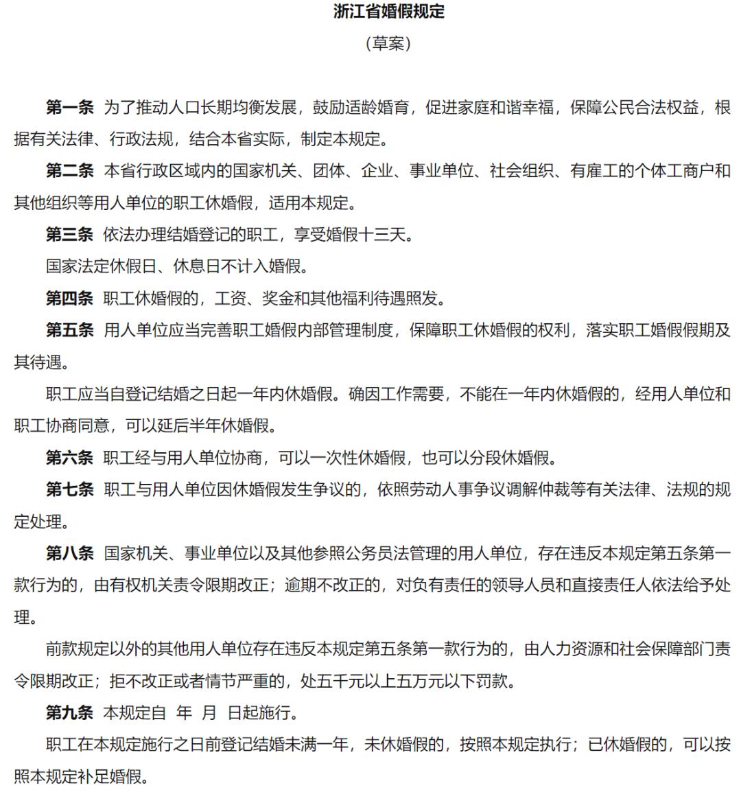 本周二(8月20日),浙江省人民代表大会官网发布消息,《浙江省婚假规定(议案)》拟提交省十四届人民代表大会常务委员会第十二次会议审议,现公开征求意见。
