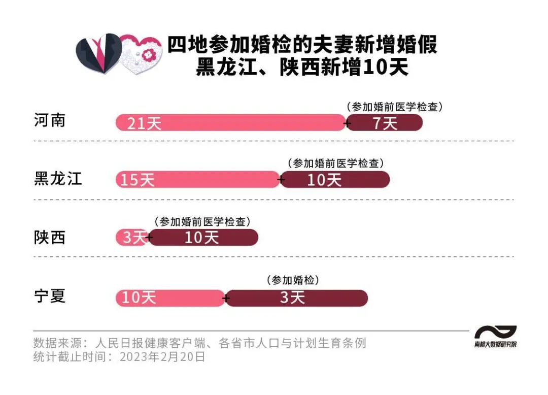 值得一提的是,河南、黑龙江等地为婚前参加医学检查的夫妻增加了额外的婚假,其中黑龙江、陕西增加了10天(黑龙江共25天,陕西共13天),河南增加了7天(共28天),宁夏增加了3天(共13天)。
