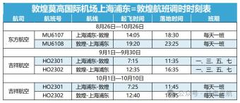 8月26日至10月26日,东方航空MU6107/8上海浦东=敦煌航班调整至14。:1805从上海浦东起飞,:30抵达敦煌,19:20从敦煌起飞23:25到达上海浦东,每天执行一次班次;