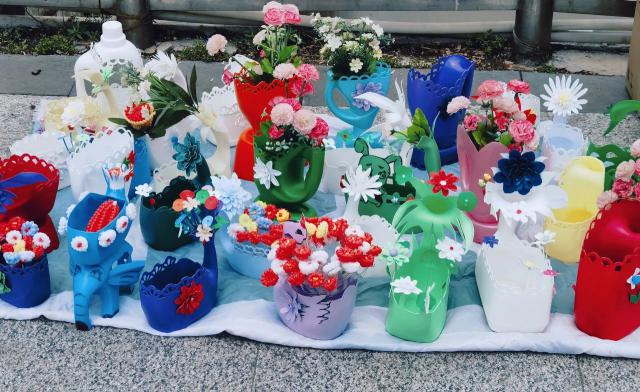6月下旬的一个周末早上,我在大坝上跑步,一个穿着简单白发的奶奶摆的摊位吸引了我停下来。这些以洗衣液包装瓶为主要材料制成的“盆景花”真的很美,成为夏天的一道独特风景,旁边有很多游客上去观看。我向奶奶竖起大拇指,称赞她的美丽。奶奶开心地笑了,脸上好像开了一朵花。