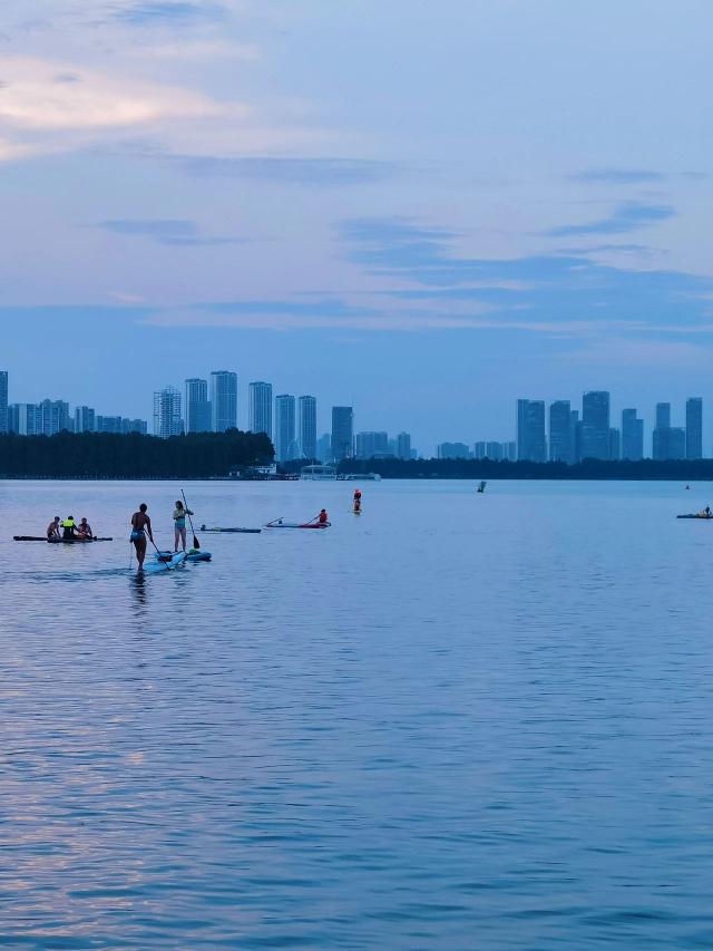 武汉三伏天的傍晚,在东湖听涛景区的水上运动中心,夕阳静静地映在波光粼粼的湖面上。每个人都愉快地划着皮划艇嬉水,锻炼身体,享受凉爽的夏天。