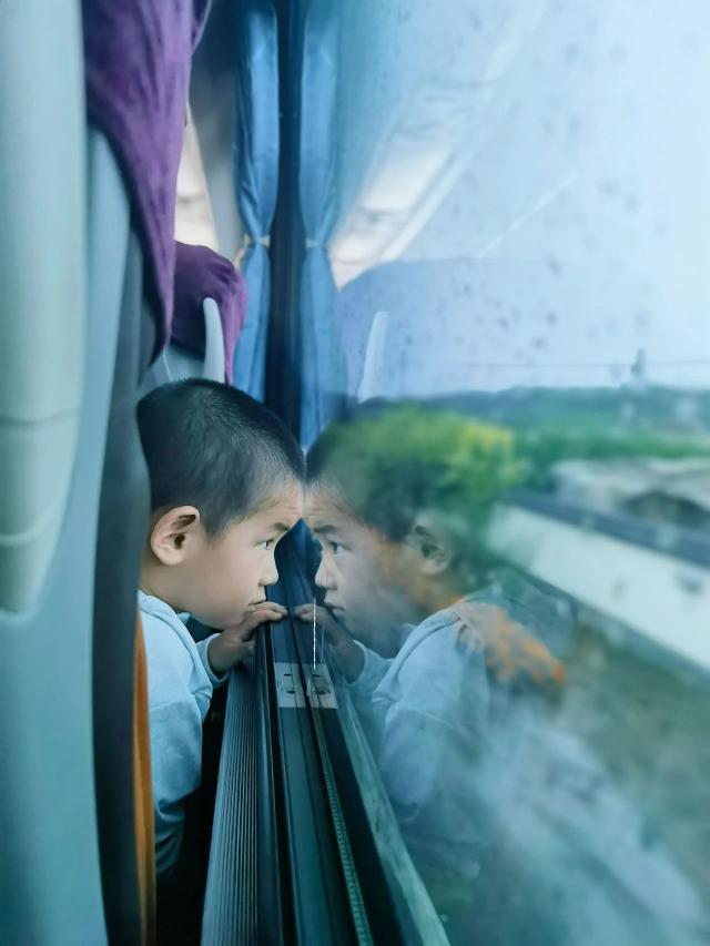 盛夏,我和妻子带着橡子水果(我们的儿子)回到家乡过暑假。在公交车上,三岁多的橡子水果被窗外无尽的“绿色”和不断向后的风景所吸引,头顶在窗户上,向外看。我觉得后座很有意思,就用手机记录了下来。