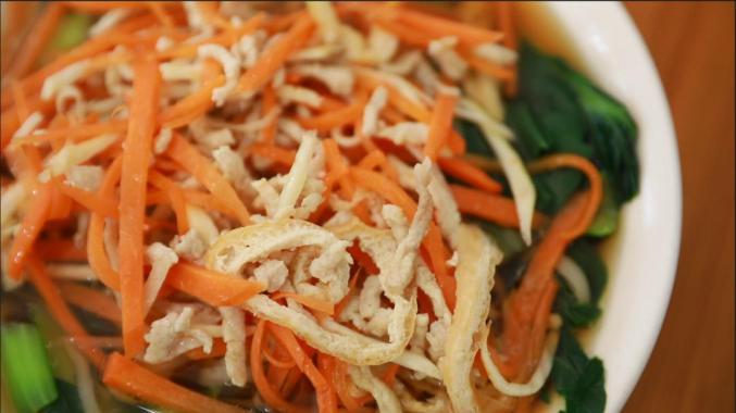 “面条”中的“面条”是一个动词,意思是用竹棒压出来的面条。打开锅,等几分钟,把下一个新鲜的切好的面条和现在在田里采摘的青菜放在碗里,用两勺酱油,一勺猪油和几颗葱花作为汤底。热气腾腾的面条和蔬菜被捞进碗里,加入一勺面汤和两勺,用胡萝卜丝、肉丝、鲜笋等爆锅制成浇头。面条口感顺滑有力,炒出来的时候充满了气。