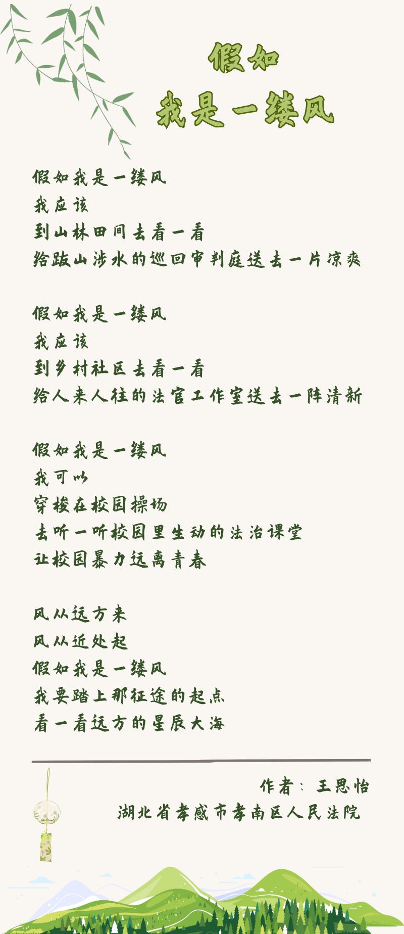 近日,孝感市孝南区人民法院干警王思怡的诗《如果我是一缕风》被中国法官文学艺术联合会推荐为经典作品!