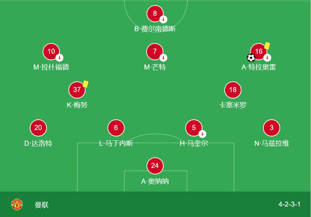 曼联半场落后一球,换边后立即做出刺激,由约书亚进行。 · 取代梅森替代梅森的齐尔克泽 · 芒特。曼联防线再次受到压力,38 岁詹姆斯 · 米尔纳进入了球脚,足球超过了安德烈 · 得益于迪奥戈,奥纳纳慢慢滑向白界线。 · 达洛特早到一步,成功地保护了空门。