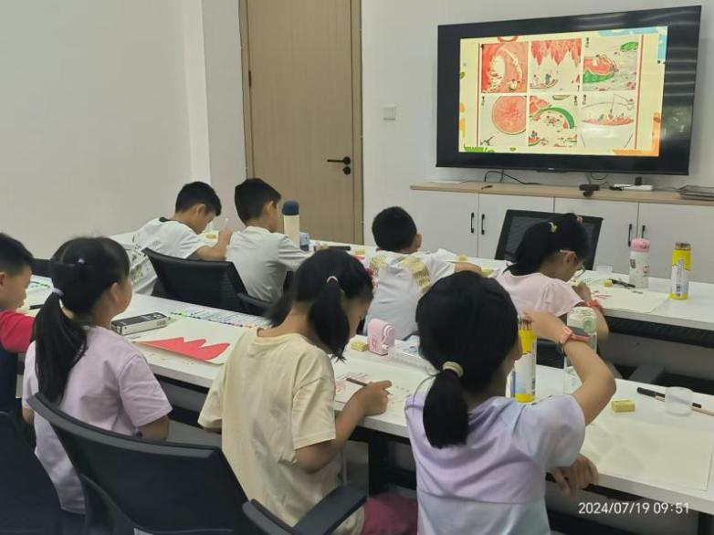 学生们还为社区居民组织了丰富多彩的审美教育活动。叶思颖组织青少年绘画活动,在淞港星苑社区举办“西瓜梦游记”绘画课,以西瓜为元素,让孩子充分发挥想象力,改造西瓜。在指导下,孩子们把西瓜变成了冰淇淋、汽车、游泳池等。,并拓展了他们对颜色的多维理解。