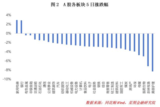周内三大指数集体收跌,创业板指数暴跌。 2.80%。从行业来看,保险、银行、家用电器、贵金属等板块涨幅居前,农业、生物技术、日用化工等板块跌幅居前。两市普遍涨跌,市场人气低迷,成交量萎缩至 5000 亿水准。