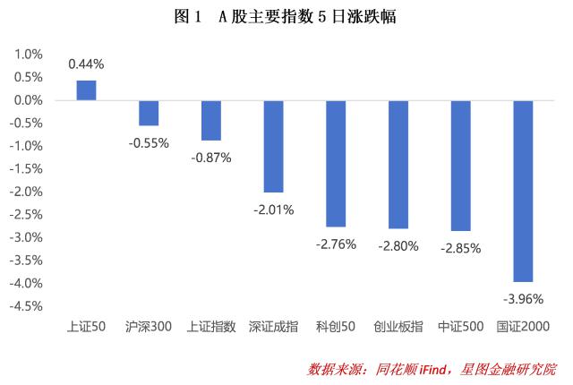周内 A 股票集体收跌。7 大型指数集体下滑,市场盈利效果极差。就市场风格而言,体现为“越大越强”,大盘股表现最好,小盘股表现最差,上交所 50 甚至逆势上涨 0.44%,同时国证。 2000 暴跌 3.96%。价值表现明显强于成长,科创 50、创业板指的是跌幅 2.5% 上述,均创下半年以来的新低,仅次于下半年。 2 月亮的闪崩点。