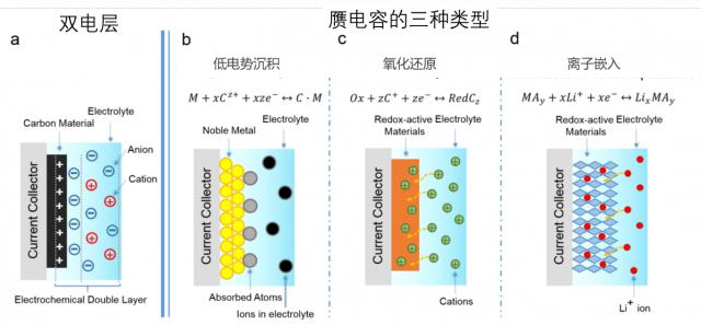 图 4 超级电容的双层原理和三种常见的假电容类型