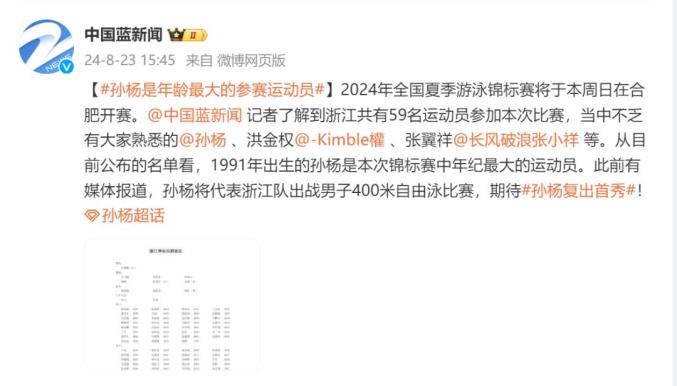 最近的秩序册显示,孙杨报项成绩为3分45秒。