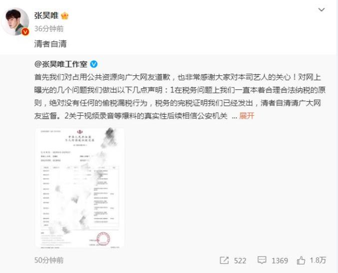 随后,张昊唯工作室微博发表声明回应,张昊唯分享声明称“清者自清”: