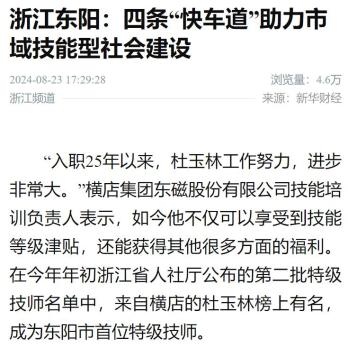 8月23日,新华社客户端报道《浙江东阳:四条“快车道”助力城市技能型社会建设》,关注东阳市大力实施技能型人才倍增项目,全面推出社会评价、学校小组评价、公司自我评价、竞赛评价四条“快车道”,全力推进城市技能型社会建设。