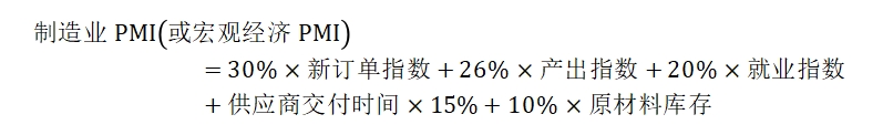 PMI除了上述三个常见指数外,还提供宏观经济、建筑和零售的PMI指数。服务业、建筑业和零售业的PMI指数生成只源于问卷中的一个问题,那就是“你认为商业活动水平高于/持平还是低于上个月?”。制造指数和宏观经济指数由分项加权组成,加权公式为: