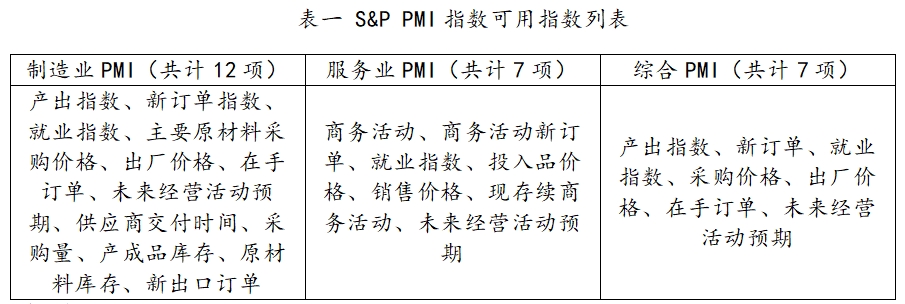 S&P PMI主要分为制造业PMI。、PMI和综合PMI服务行业,可用指数涵盖了以下几个生产/服务过程中的细节(见表一)。