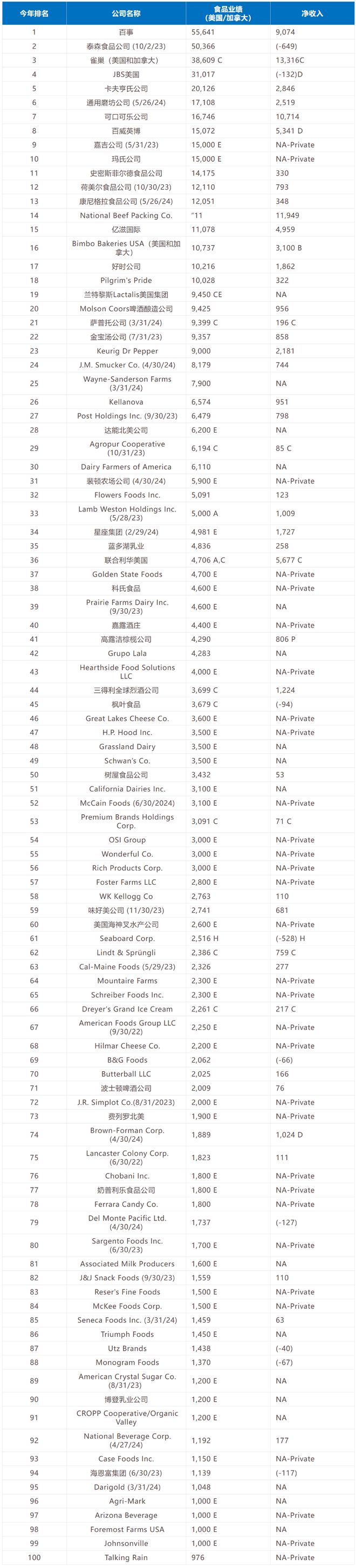 以下为2024年北美食品饮料100强榜单。