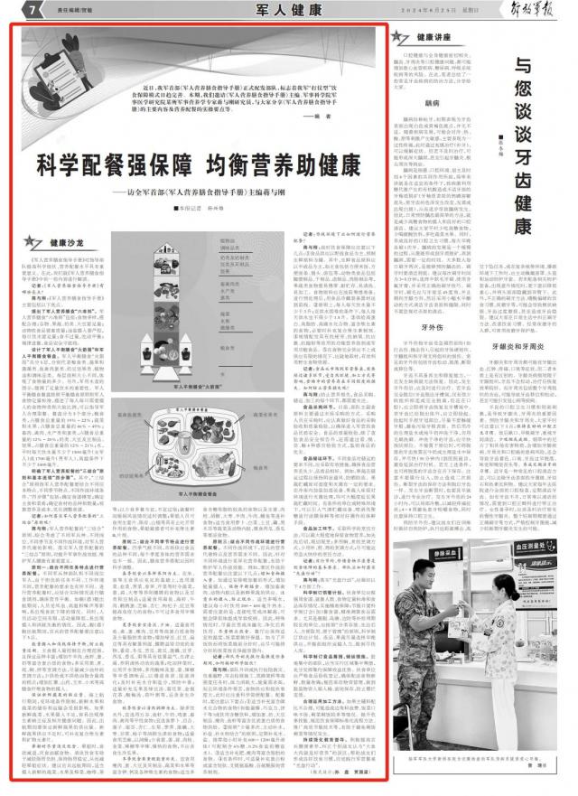 蒋与刚:军事营养餐的“三合一”原则综合考虑了不同军种、不同岗位、不同季节、不同战斗环境对军事营养代谢的影响。实施军事营养餐的“三合一”原则,对提高军事作战效率、维护军事健康具有重要意义。