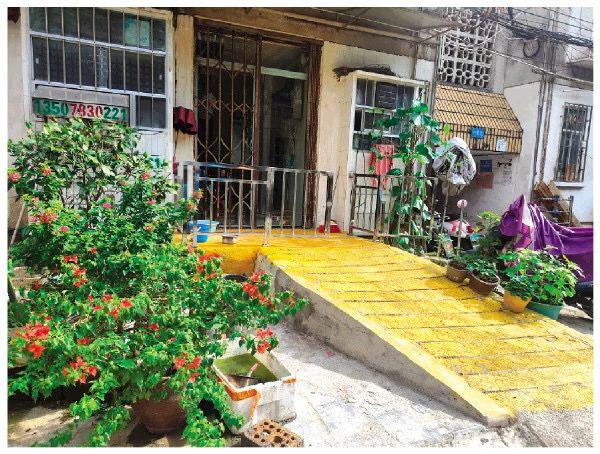 廖玉华家门前进行了无障碍改造,并安装了护栏,斜坡两侧种满了鲜花和绿色植物,显得温馨而有生活乐趣。