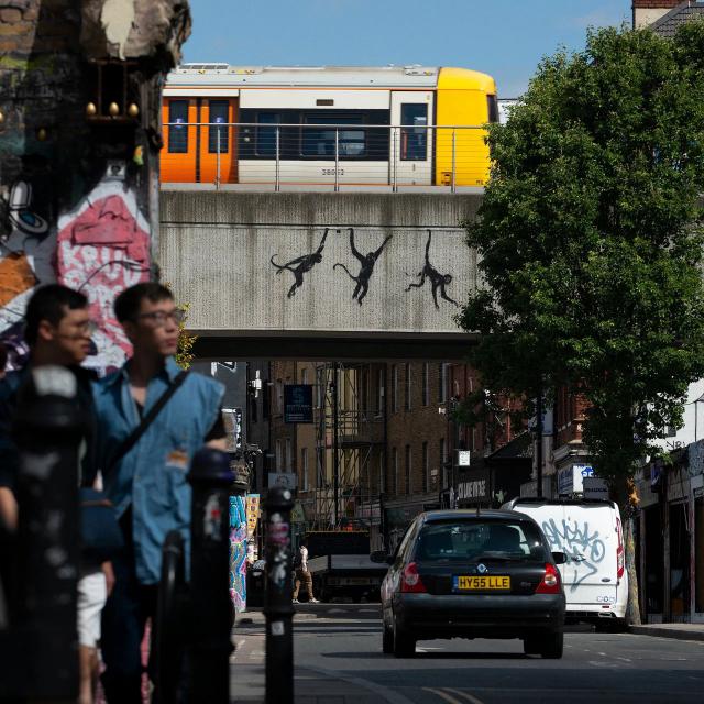 接着,星期三出现的三只猴子,他们摇摇晃晃地穿过伦敦东部布里克巷的一座桥。