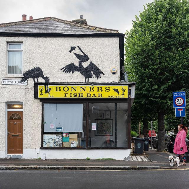 周五,比勒陀利亚大道拐角处沃尔瑟姆斯托的一家炸鱼薯条店上方出现了一对饥饿的鹈鹕,他们的长喙在招牌上捕鱼。