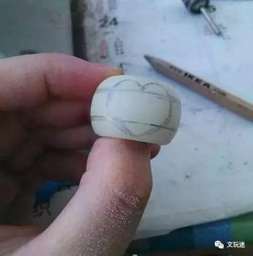 画完线后,我们可以用磨盘、砂轮、挫刀、雕刻刀、砂纸或所有你想要的工具,沿着线磨掉多余的部分,不需要快速绘制,小心破坏桃心的形状。磨完之后,心形钻戒已经初具规模。