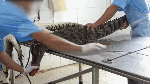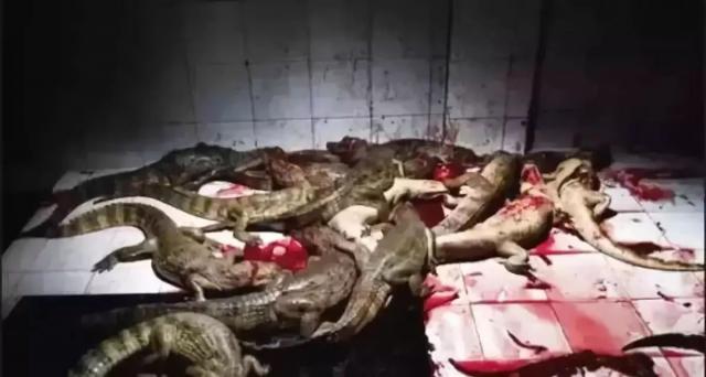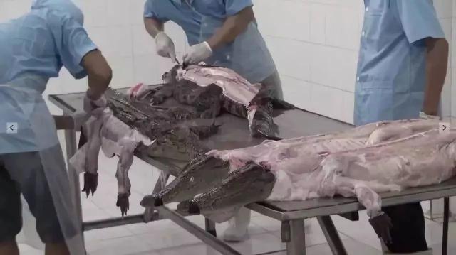 但是鳄鱼的生命力极强,在清醒状态下被工作人员用短刀去皮后,仍然可以留下一丝气息。