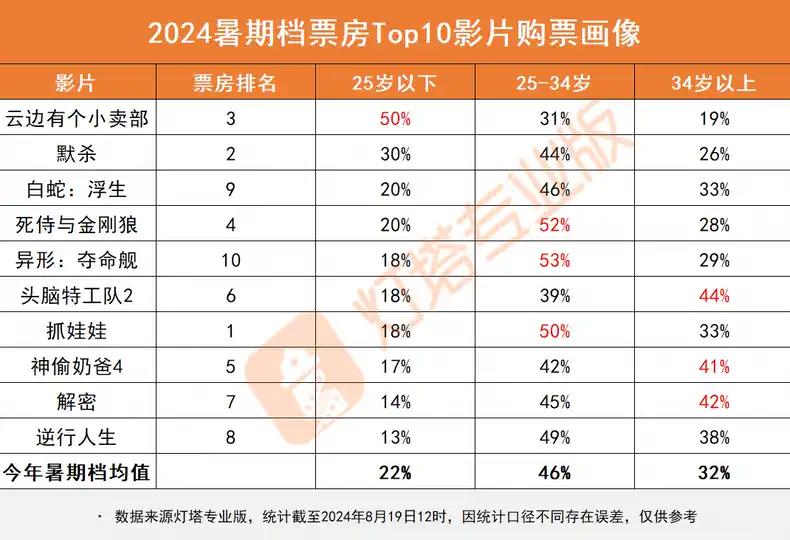 年轻观众一直是电影市场最需要吸引和培养的观众,暑期档做得很差。《云边有个食堂》和《默杀》是25岁以下观众的最高比例,占比50%和30%。《抓娃娃》、《解密》、《逆行人生》等电影都跌到了18%以下。