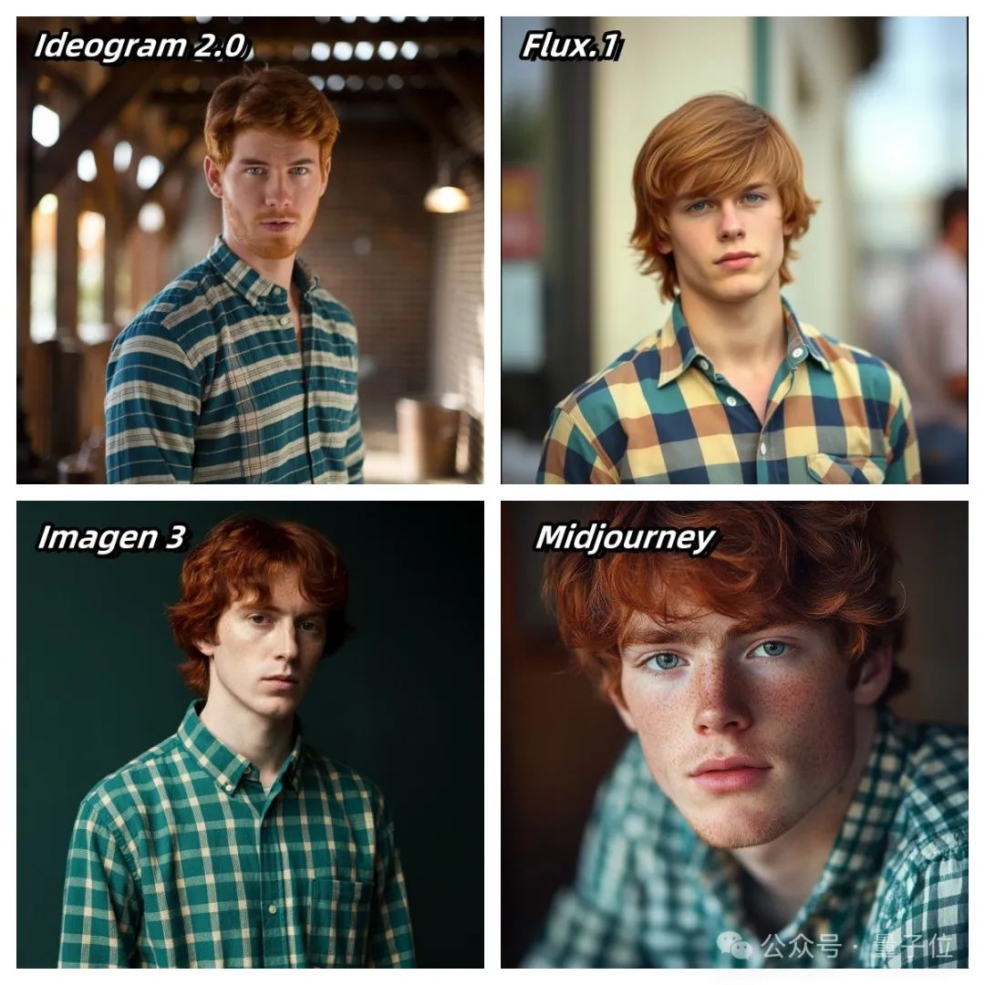 就细节而言,2号Flux.1稍有出入,衣着多了两种颜色,这在一水蓝绿格子衬衫中尤为明显。