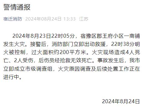 2024年8月23日22时05分宿豫区郡王府小区一家商店发生火灾。接到报警后,消防部门立即出动救援,22时38分明火被控制,过火面积约200平方米。