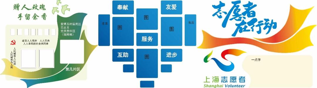 邢思怡参与了爱博五村居民区特色走廊展板的设计。通过与22号楼居民的沟通,我们发现许多活跃的社区志愿者住在走廊里,在与居民和居委会工作人员讨论后,他们一致决定以“志愿服务”为特色走廊主题。