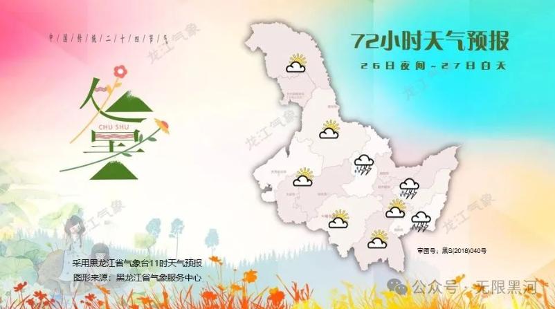 26日晚至27日白天:伊春、鹤岗、佳木斯、双鸭山、鸡西阴天有阵雨或雷雨,其他地区有时晴天多云。