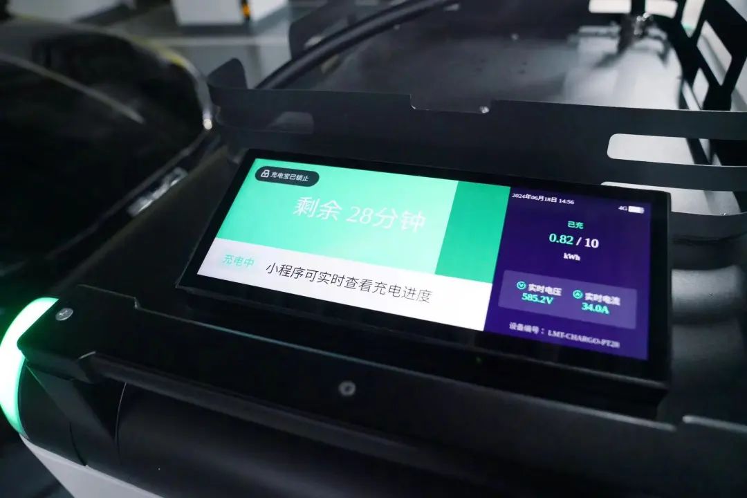 在移动充电车前面,设置了显示屏。充电时,可以显示剩余的充电时间、充电量、即时电压、即时电流等数据。