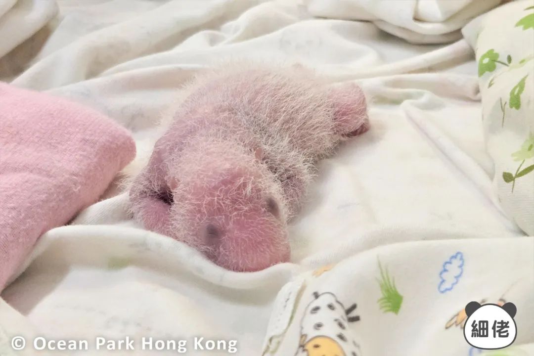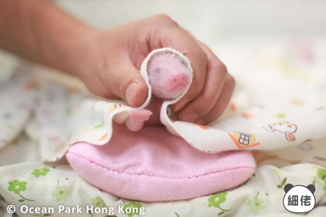 大熊猫宝宝头一周的成长记录和熊猫母亲“盈盈”照顾宝宝的照片在海洋公园发布。