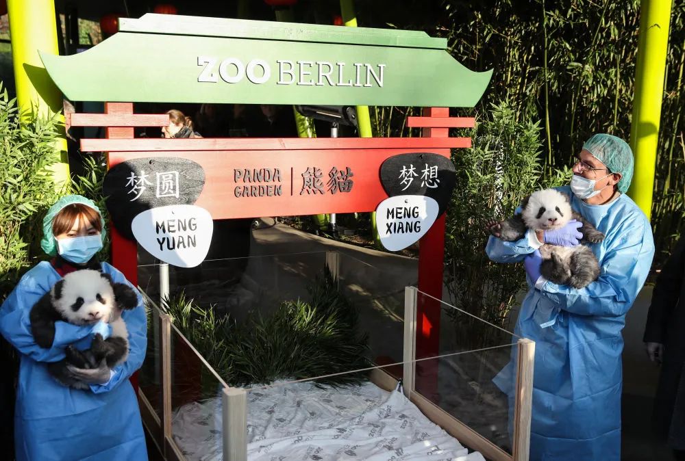 2019年12月9日,在德国柏林动物园,工作人员抱起了熊猫双胞胎的“理想”(右)和“梦想”。新华社