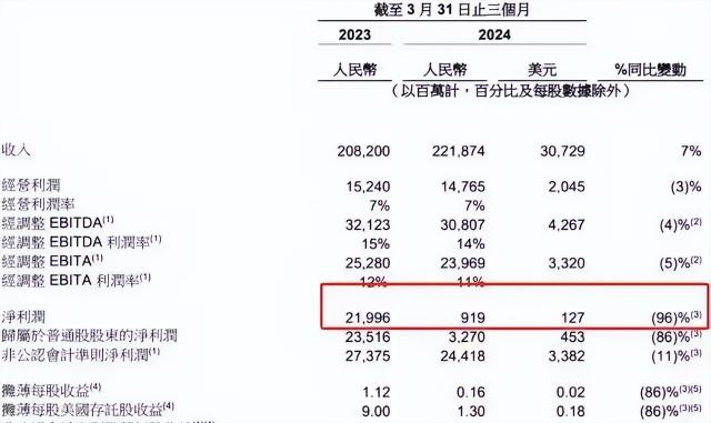 根据官方公布的财务报告数据,阿里 2024 第一季度纯利润仅为 9.19 亿元,同比暴跌 96%。