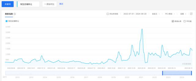 因此,在 2023 年底仅退款政策出台后,淘宝经历了商家关闭的浪潮。当时搜索指数的“淘宝店铺转让”词条搜索达到了一个高峰。
