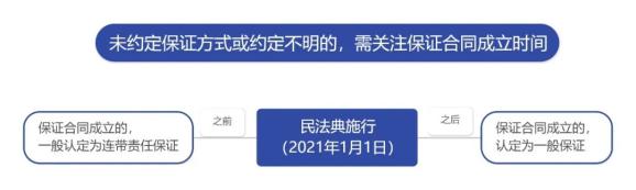 在民法实施前(2021年1月1日)设立的保证合同,一般认定为民法实施前(2021年1月1日)设立的保证合同的连带责任保证;民法实施后(2021年1月1日)设立的保证合同,视为一般保证。