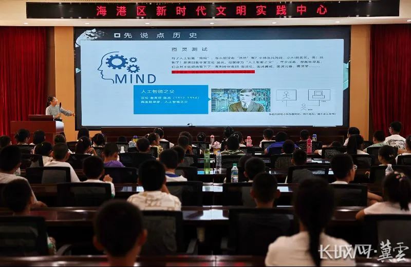科普志愿者向儿童讲解人工智能知识。海港区媒体中心 曹建雄 摄