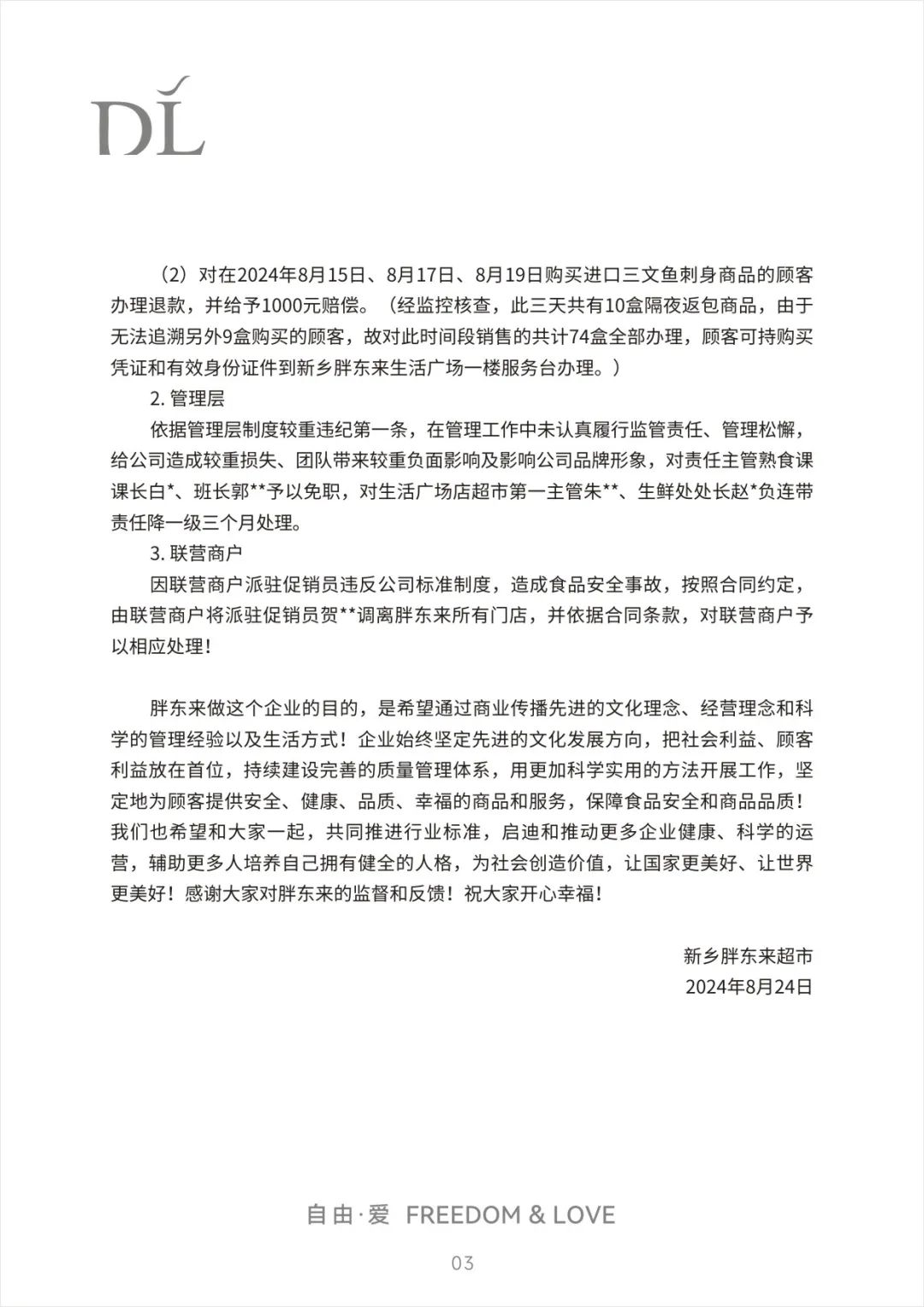 处理相关责任人:联合经营者派驻促销员贺某某调离胖东所有门店,并根据合同条款对联合经营者进行相应处理;责任主管熟食班班长白某某、班长郭某某被辞退,生活广场店超市第一主管朱某某、生鲜处处长赵某连带责任降级三个月。