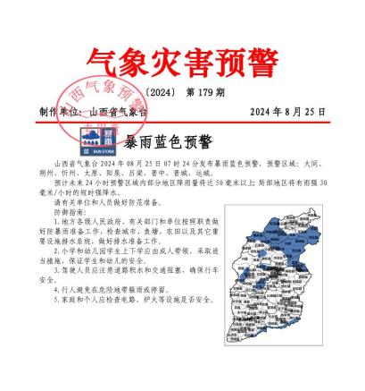 2024年8月25日07时24分,山西省气象台发布蓝色暴雨预警区:大同、朔州、忻州、太原、阳泉、吕梁、晋中、晋城、运城。