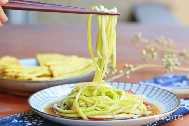 1. 西葫芦洗净用刨丝机刨细条,放入冰水中冷却一段时间,可以消除涩味,增加酥脆的口感,沥去水分摆盘。