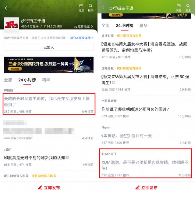 此外,上虎扑最近一段时间,在最热门的板块“步行街主干道”上, 24 在小时清单上,总会有一个标题来描述两性生活,标题通常是这样的。