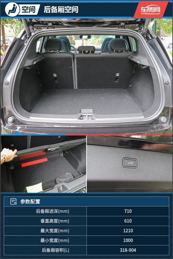后备箱的整体性能相当令人满意,地板底部设计了一个隐蔽的储物槽。一般情况下,后备箱的容积是 318L,后排座椅支撑比例放下,放下后容量可扩展至 904L。