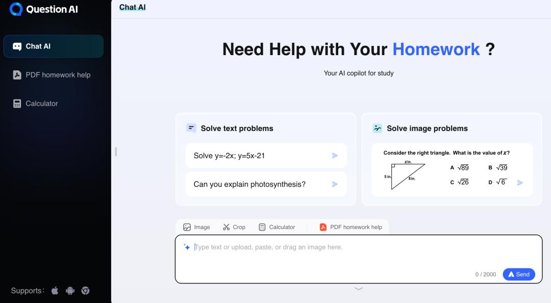 相对于传统的照片解题应用,Question AI提高了AI对话的权重,不管是网页端还是APP端,首先引导用户使用的是自己的对话功能,类似于Guath的全学科覆盖,Question AI还支持多学科答题,只需在对话框中输入相关问题或上传资料即可。