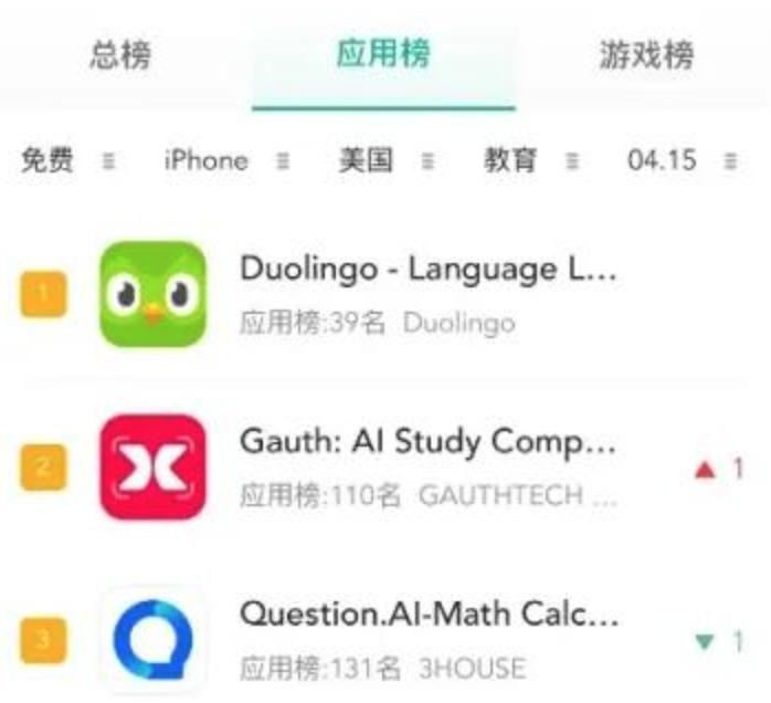 事实上,从今年年初开始,Question AI和Gauth已经成为美国区域应用商店下载排名的常客。巅峰时期,他们都跃居教育应用前三,成为仅次于许多邻国的热门教育应用。