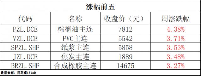 上周,国内期货主连续五大涨幅分别为棕榈油。 4.38%、PVC3.71%、纸桨 3.53%、焦碳 3.48%、合成橡胶 3.27%。